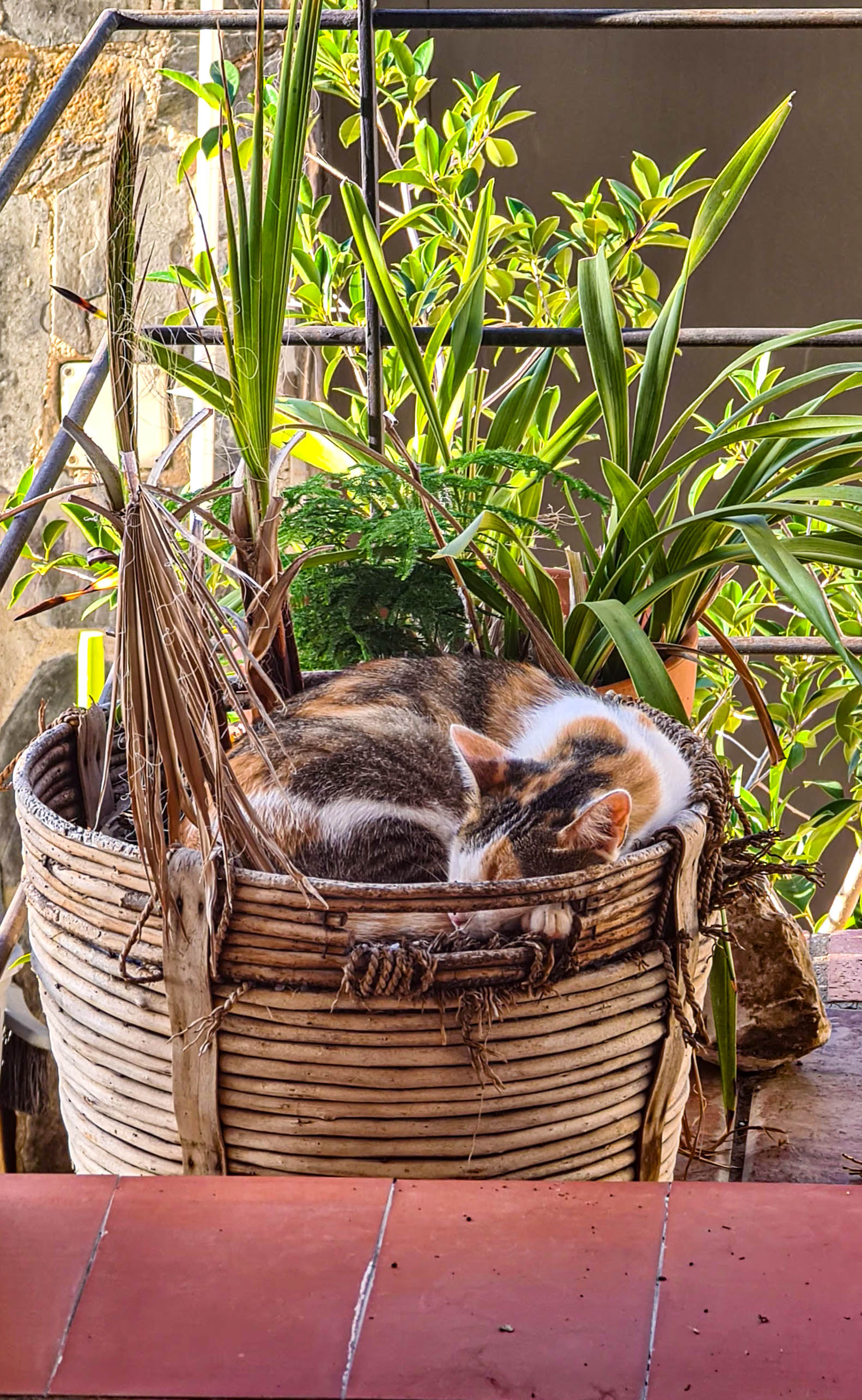 Me parece una foto estupenda. Tanto el primer plano (solo me sobran las baldosas rojas) de la cesta con el gato, tan rico en texturas, contrapuesto con el segundo plano de vegetación luminosa, todo ello sobre el fondo gris neutro, proporcionan una foto con gran profundidad y riqueza de matices.