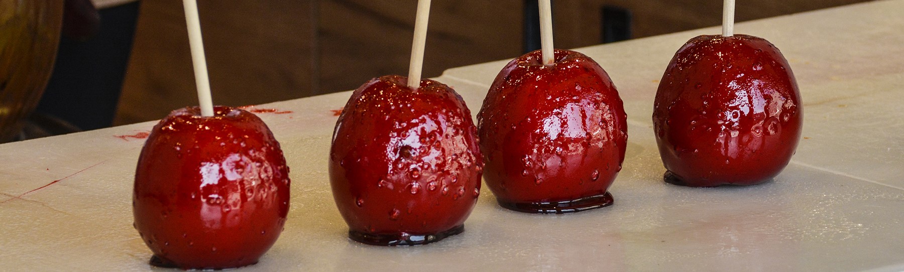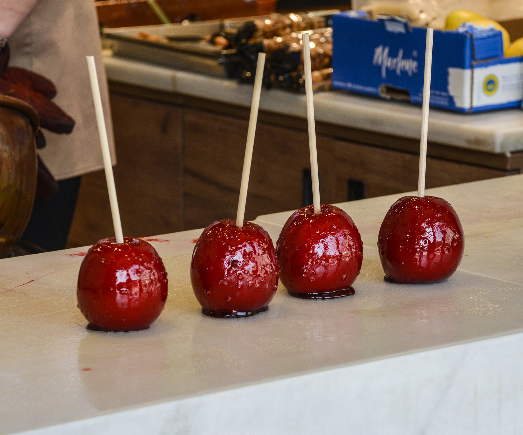 Tampoco es la foto que buscaba cuando la hice. Pensé que el caramelo era más brillante y liso y quería haber sacado el reflejo visible de los arcos de la Plaza Mayor en cada manzana. Pero cuando vi la foto en casa me di cuenta de lo irregular del baño de caramelo y de que no cumplía mis expectativas. Una pena, porque hubiera sido una buena foto, incluso con la caja azul de fondo.